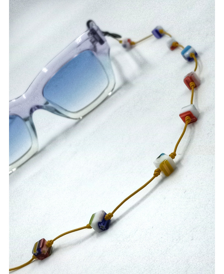 Este cordón destaca por sus nudos de cuero combinado con cuentas de cristal Millefiore de Murano. Un abalorio muy especial porque combina aleatoriamente sus colores que añaden brillo, color y diversión a este elegante y clásico complemento para personalizar tus gafas.