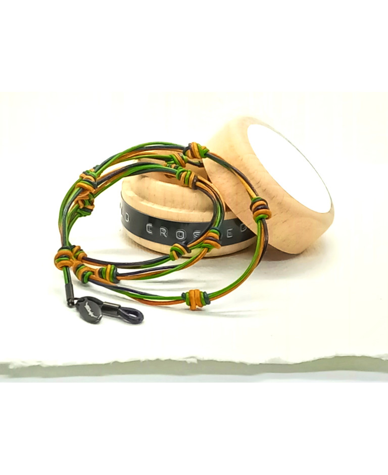 Cordón elaborado con tres finos hilos de cuero, combinando el cordón natural con cuero VERDE y cuero amarillo.